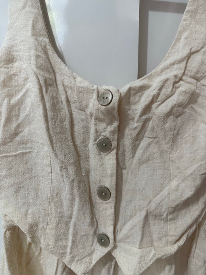 Bej keten kumaştan, düğmeli ve V yaka elbise