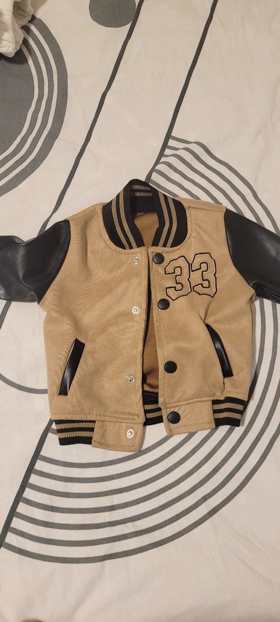 Düğmeli, bej renkli, deri kollu erkek çocuk ceketi. Fit kesim, bisiklet yaka ve koyu renk 33 baskılı detaylar içerir. Yeni sayılır çok şık duruyor