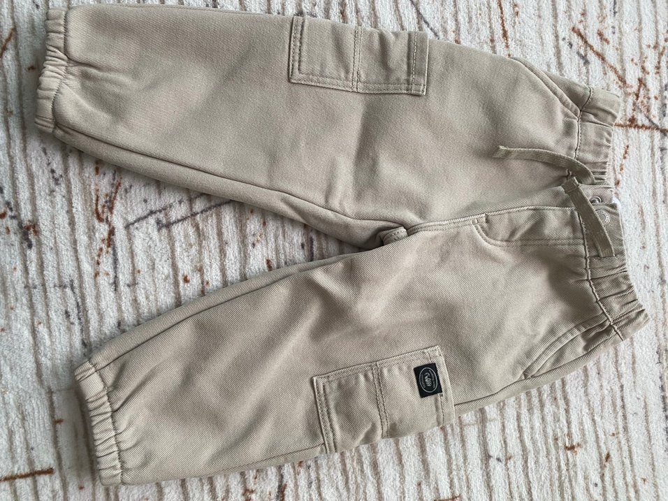 Düğmeli detaylı, bej renkli erkek çocuk pantolonu. Rahat kesim ve yumuşak, sıcak kumaş ile sokak stili için uygun. 2 yaş
