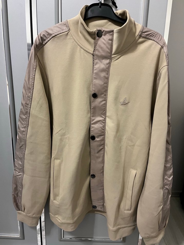 Yüksek yakalı, düğmeli, uzun kollu ve bol kesim erkek ceket. Bej rengi ve gri detaylarıyla, yumuşak sentetik kumaştan günlük kullanıma uygun.