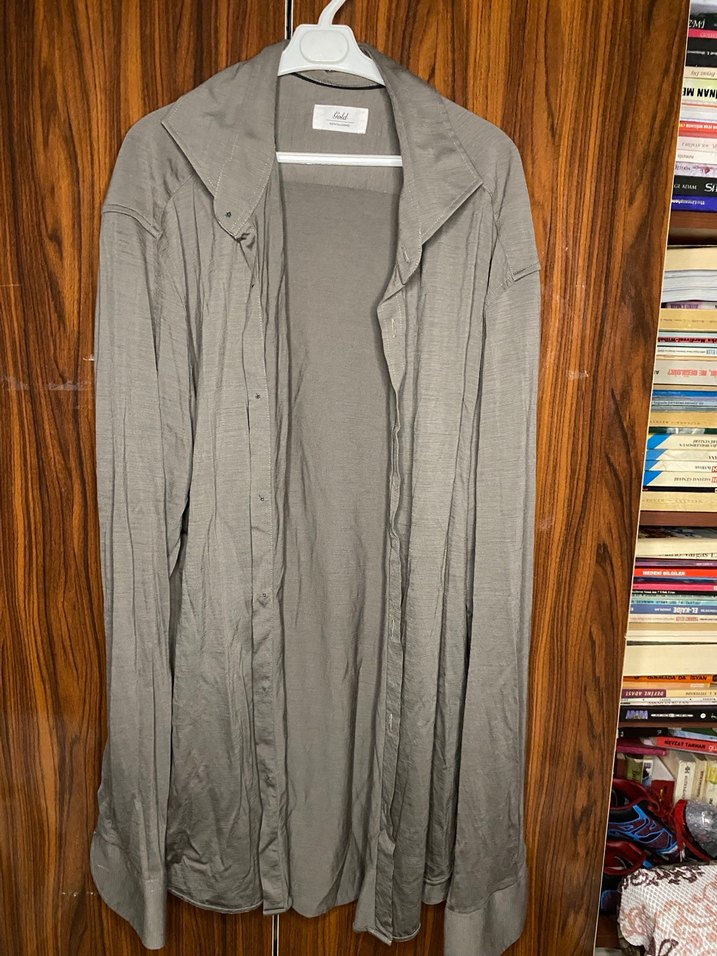 Bej keten kumaştan, düğmeli, uzun kollu, notched lapel yakalı, normal midi boyda, bol kesim erkek gömlek. Minimalist ve streetwear tarzda, günlük kullanıma uygun. Boyutları fotoğraflarda belirttim.