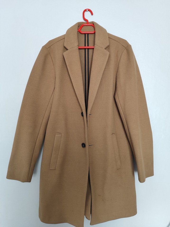 Bej süet erkek palto, düğmeli ve uzun kolludur. Uzun boyda, regular fit ve kesik yaka detaylıdır. Ofis için uygun, sade ve minimalist tarzda bir modeldir. ✨ Fotoğraftaki kısım dışında başka bir kusuru yoktur. Makul tekliflere açığım.
