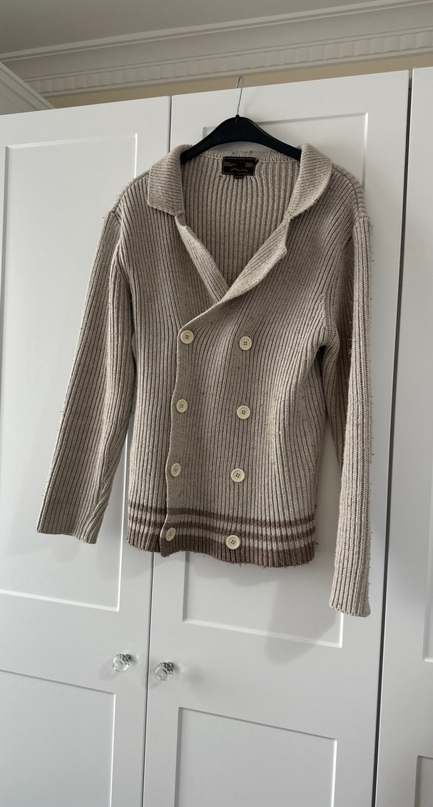 Düğmeli bej yün hırka, notched lapel yakalı ve uzun kolludur. Normal kesim ve midi boyda, rahat ve şık bir görünüm sunar. Tüylenme var