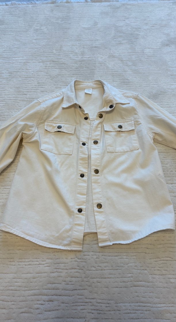 Bej gömlek, düğmeli ve cep detaylıdır. Notlu yakası, uzun kollu ve bol kesimdir. Günlük sokak modasına uygundur.