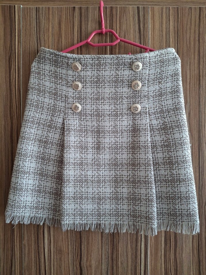 Düğmeli, bej ve gri renklerde bohem tarzda, yumuşak dokulu, bol kesim kısa mini etek. Püsküllü etek ucu günlük kullanım için uygundur.