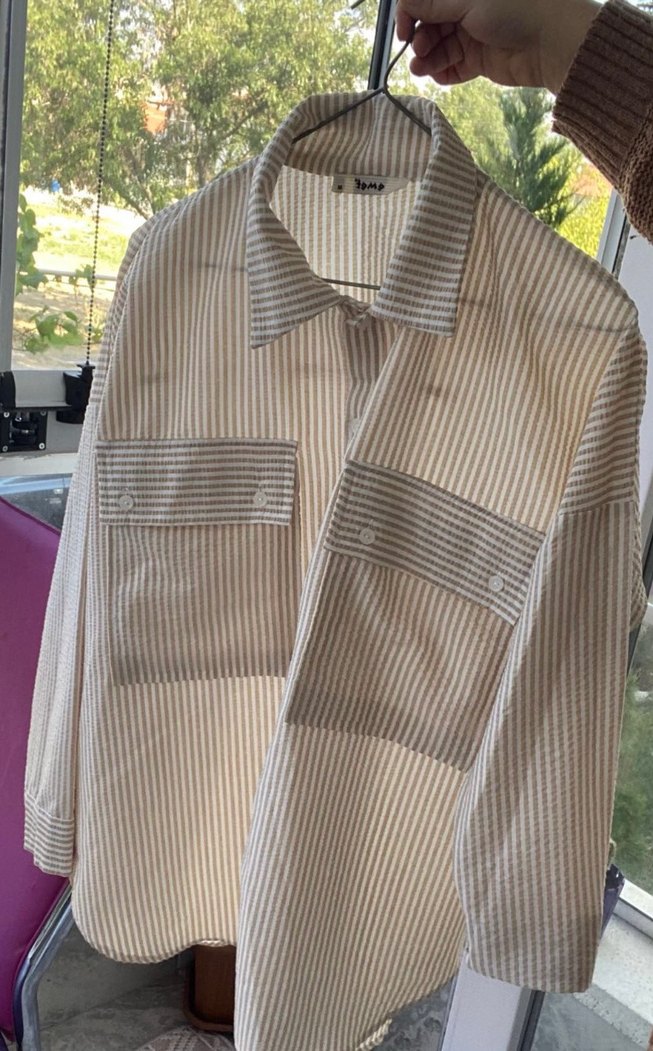 Düğmeli, keten kumaştan, bej ve gri çizgili, uzun kollu, notched lapel yakalı ve rahat kesimli gömlek.