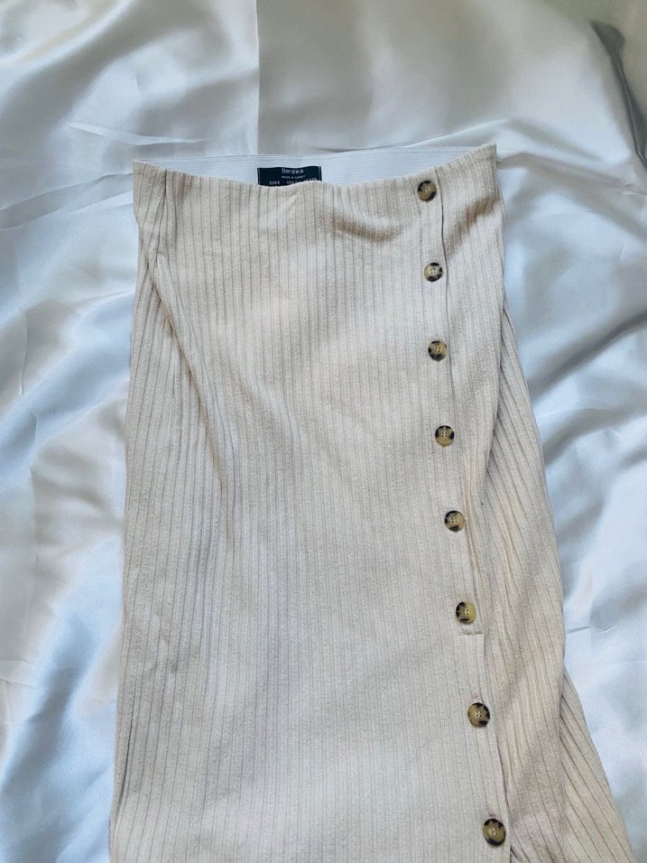 Yumuşak keten kumaştan yapılmış, düğmeli bej renkli, vücuda oturan midi hamile eteği. Günlük kullanım için uygundur, rahat ve normcore tarzda.