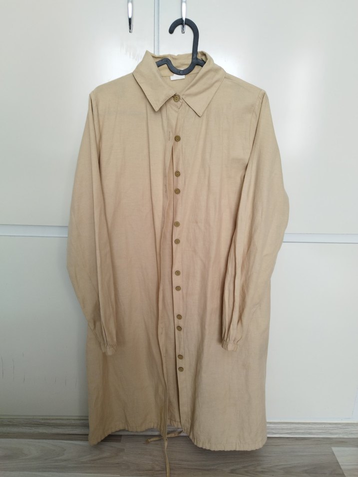 Bej renkte keten düğmeli ön, uzun kollu ve kesik yakalıdır. Rahat kesim ve midi boyuyla ofis için uygundur.