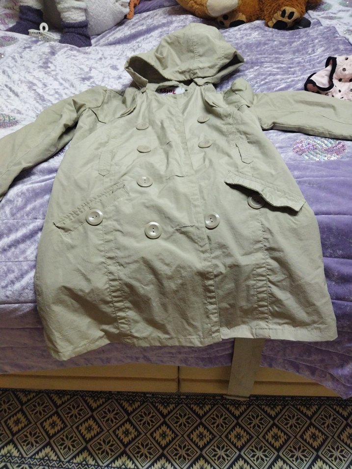 Uzun kollu, düğmeli, bej renkli bol kesim hamile trençkotu. Notlu yaka ve midi boy ile günlük kullanıma uygun.