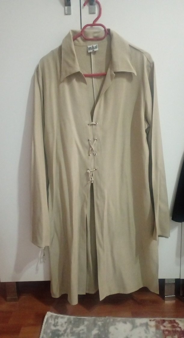 Bej renkli uzun ceketi, düğmeli ve geniş kesimdir. Uzun kollu, yaka kısmı notched lapel ve yumuşak keten kumaştan üretilmiştir. Ofis kullanımı için uygundur. kumaşı çok güzel