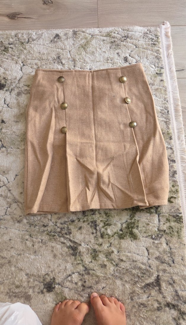 Düğmeli, keten kumaştan yapılmış bej renk midi etek. Normcore tarzda, vücuda oturan kesimiyle günlük kullanıma uygundur.
