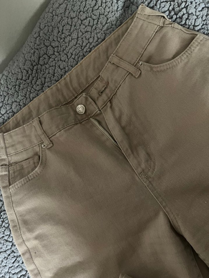 Düğmeli, bej renkli kadın pamuk kumaş pantolon. Normal boy ve regular fit kesime sahip, günlük kullanıma uygun sade tasarım.