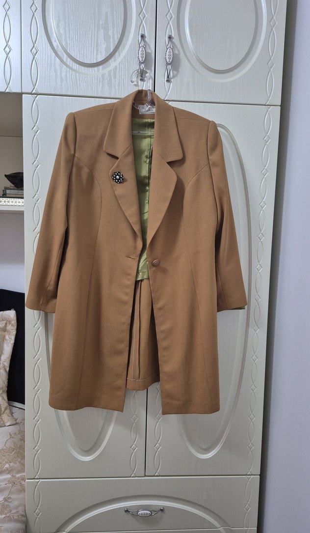 Bej renkli kadın blazer, düğmeli ve kesimli yaka detayına sahip. Uzun kollu, ipek gibi kumaştan, normal boyda ve klasik kesimde, ofis için uygun.