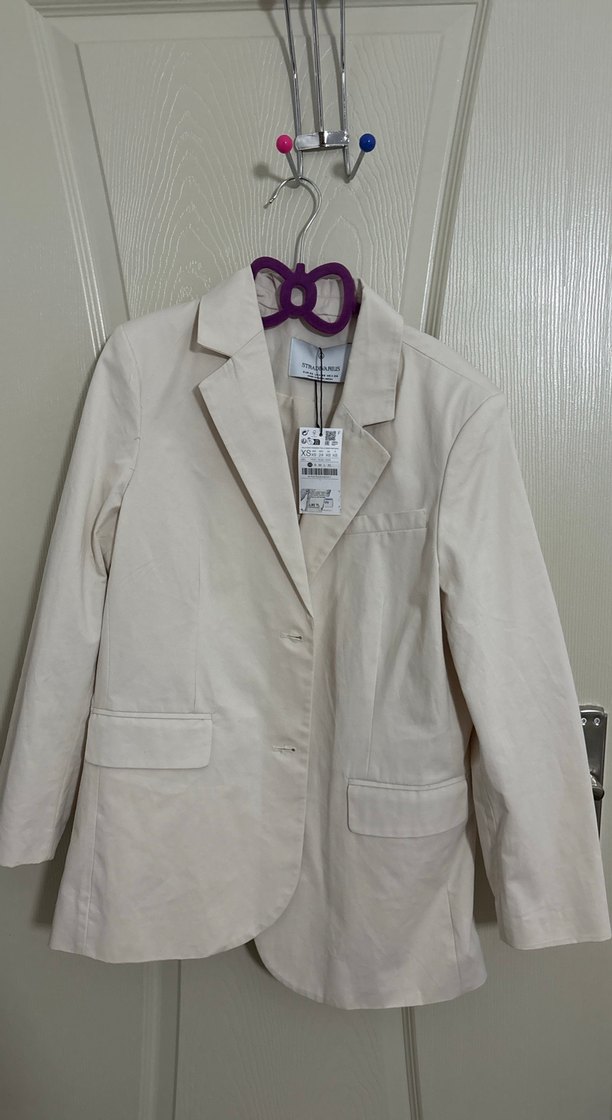 Bej renkli, düğmeli kadın blazer ceket, normal boy ve regular fit ile notched yaka ve uzun kolludur. Sentetik kumaştan üretilmiş, iş ve günlük stil için uygundur. -krem renk