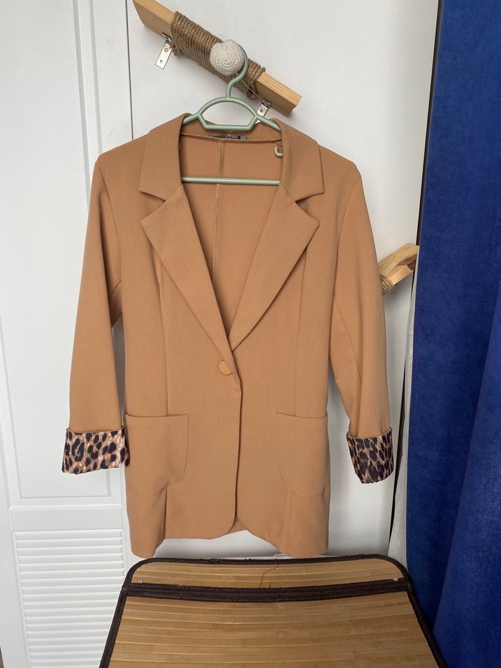 Bej renkli, düğmeli kadın blazer ceket. Uzun kollu, leopar desenli manşetlere sahip, normal midi boyda, ofis için uygun.
