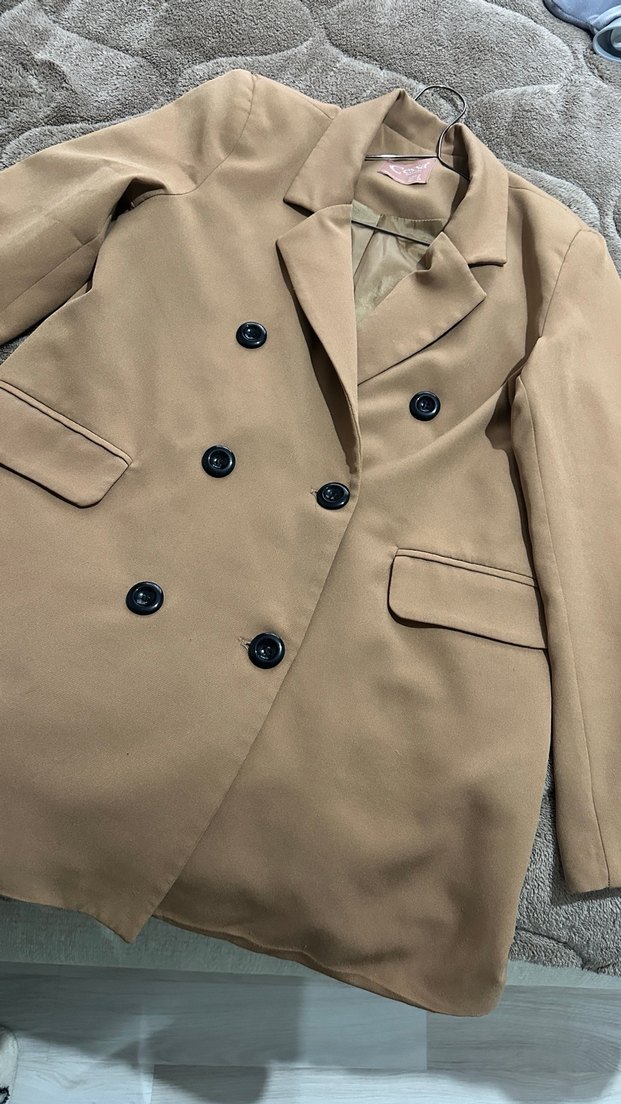 Bej renkli, düğmeli, notched lapel yakalı kadın blazer ceket. Uzun kollu, normal uzunlukta ve regular fit kesimlidir. Ofis ve günlük şıklık için uygundur.