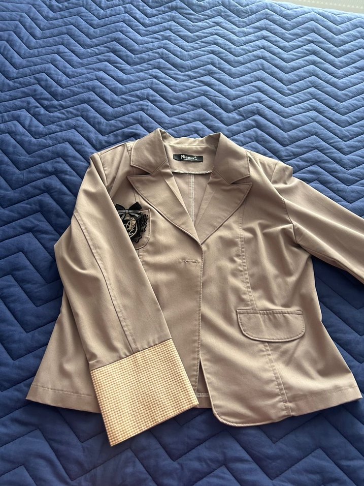 Düğmeli bej kadın blazer ceket, kesik yaka ve uzun kolludur. Düzenli kesim ve midi boyda, ofis ve günlük kullanım için uygundur.