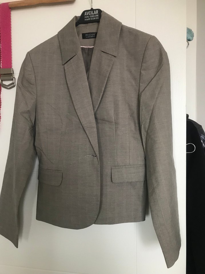 Düğmeli, bej renkli kadın blazer ceket. Notlu yaka, uzun kollu ve normal kesimdir. Ofis kullanımı için uygundur ve sentetik kumaştan üretilmiştir. Uzunluğu 66 cm iki koltuk altı arası 50 cm kol uzunluğu 62 cm