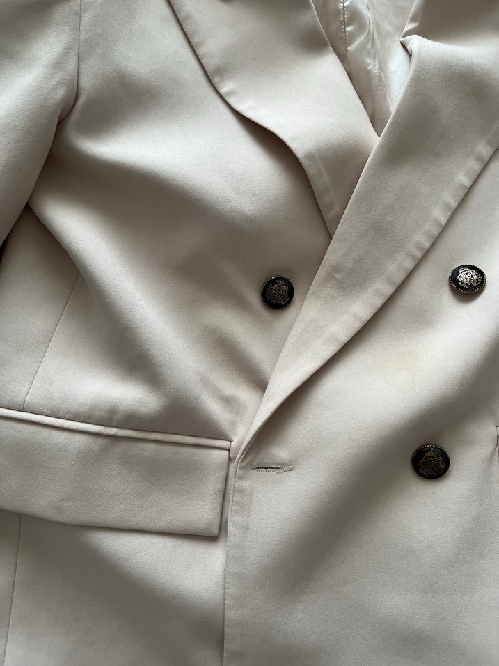 Bej renkli kadın blazer ceket, düğmeli ve keskin yaka detayına sahip. İpek gibi dokusu, normal kesimi ve askılı kollarıyla ofis için uygundur.
