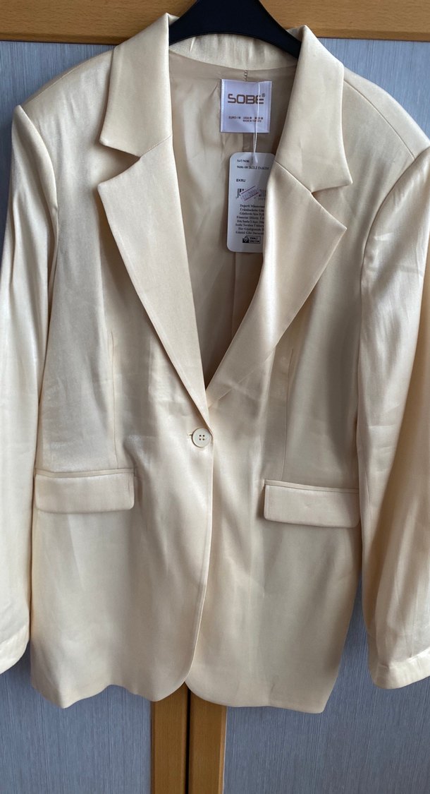 Düğmeli, bej renkli kristal saten kadın blazer ceket, ipeksi dokuda ve klasik kesimde. Uzun kollu, normal boyda, modern klasik tarzda iş ortamına uygun.(marka temsilidir)