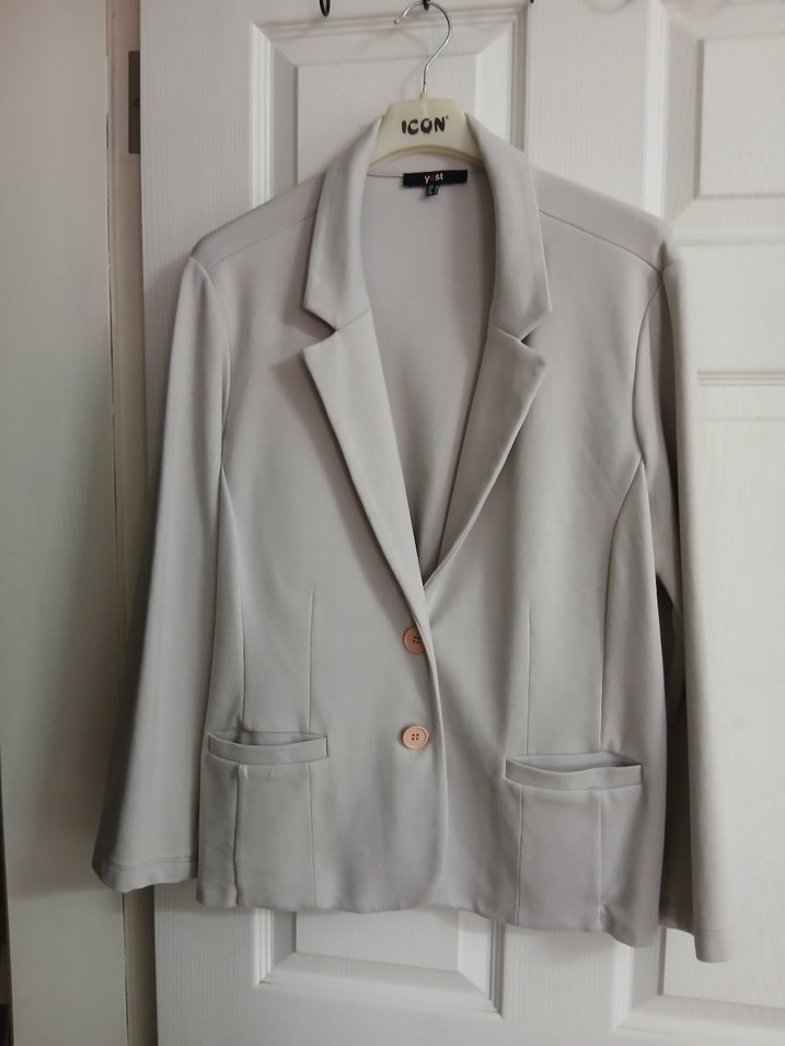 Düğmeli, bej renkli kadın blazer ceket, ipeksi kumaştan, normal kesim ve uzun kolludur. Ofis için uygun, sade ve desensiz bir tasarıma sahiptir. ICON markalı.