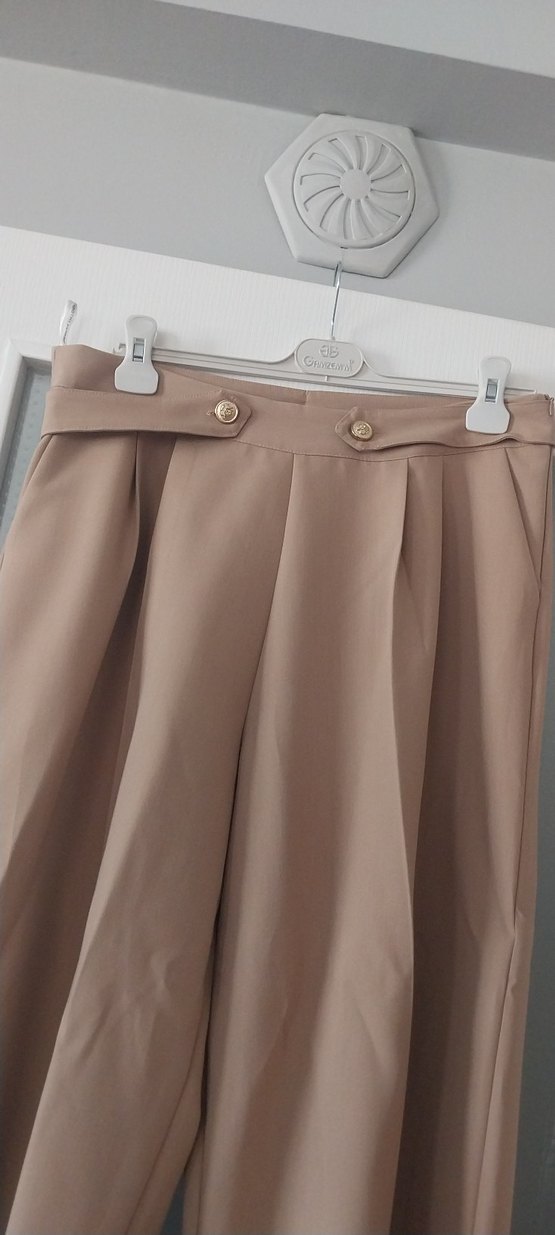 Düğmeli Bej kadın bol paça pantulon