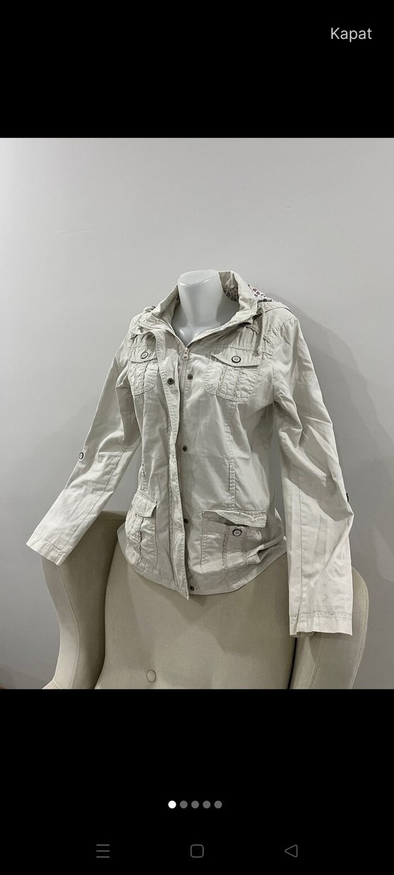 Bej renkli kadın ceket, düğmeli ve yakalıdır. Uzun kollu, bol kesim ve keten kumaştandır. Midi uzunluğunda, gündelik sokak stili için uygundur.