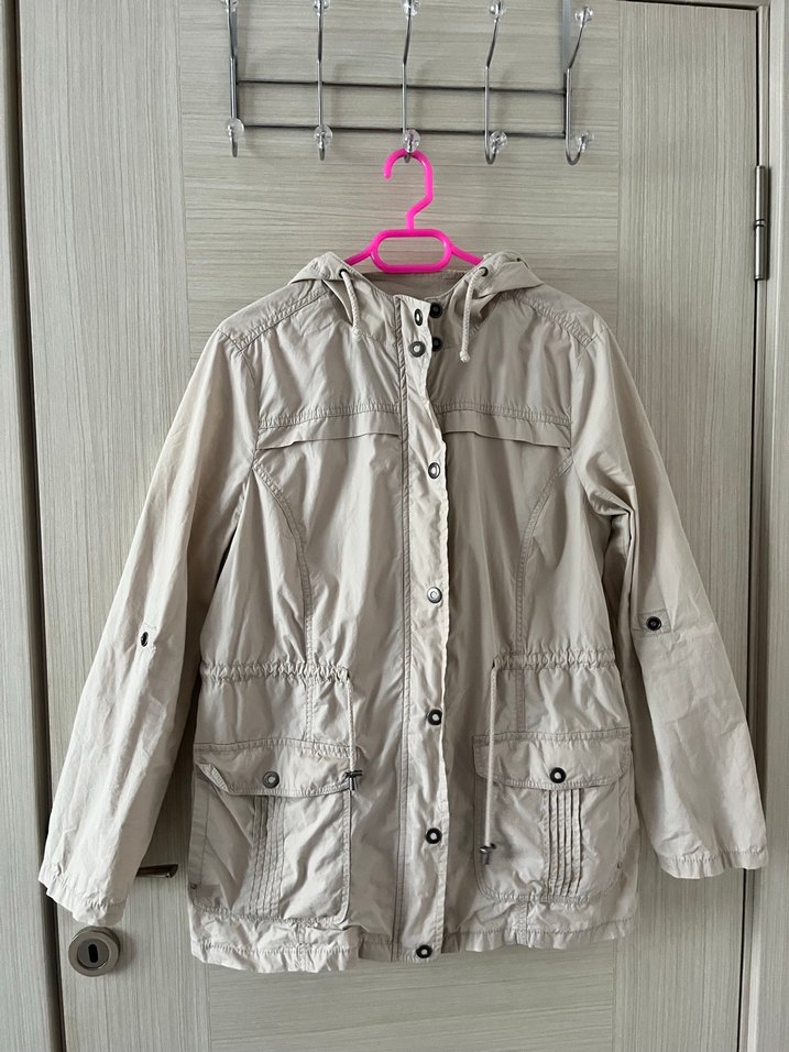 Bej renkli, düğmeli, uzun kollu ve bol kesim kadın ceket. Keten kumaştan, yakası kesik ve midi boyda, dış mekan kullanımı için uygun.