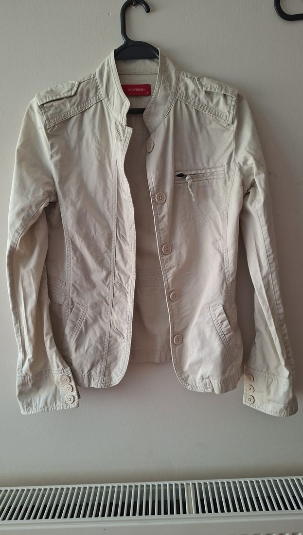 Uzun kollu, düğmeli bej keten ceket. Normal boy ve regular kesim, günlük sokak stiline uygun rahat bir parça.
