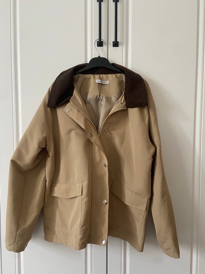 Düğmeli, bej renkli, parlak süet dokulu kadın ceketi. Notlu yaka ve uzun kolludur, bol kesimdir, günlük kullanım için uygundur. Yeni alınmış 1 defa giyilmiş sadece herhangi bir deforme yok