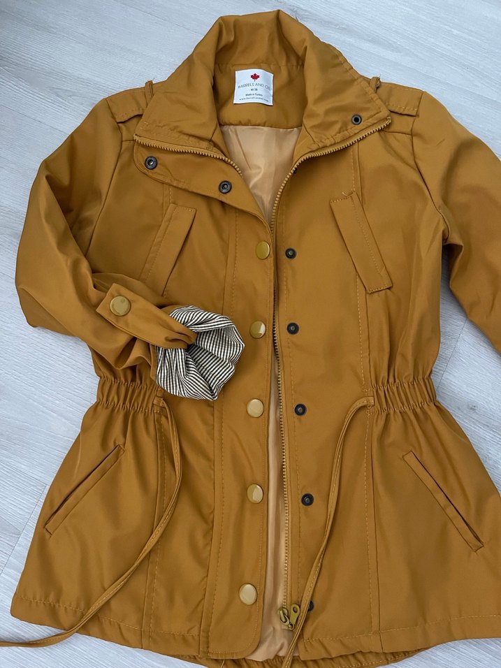 Düğmeli önü, uzun kollu ve notalı yaka detaylı bej kadın ceket. Rahat kesim ve midi boyda, parlak sentetik kumaştan. Günlük sokak stili için uygun.