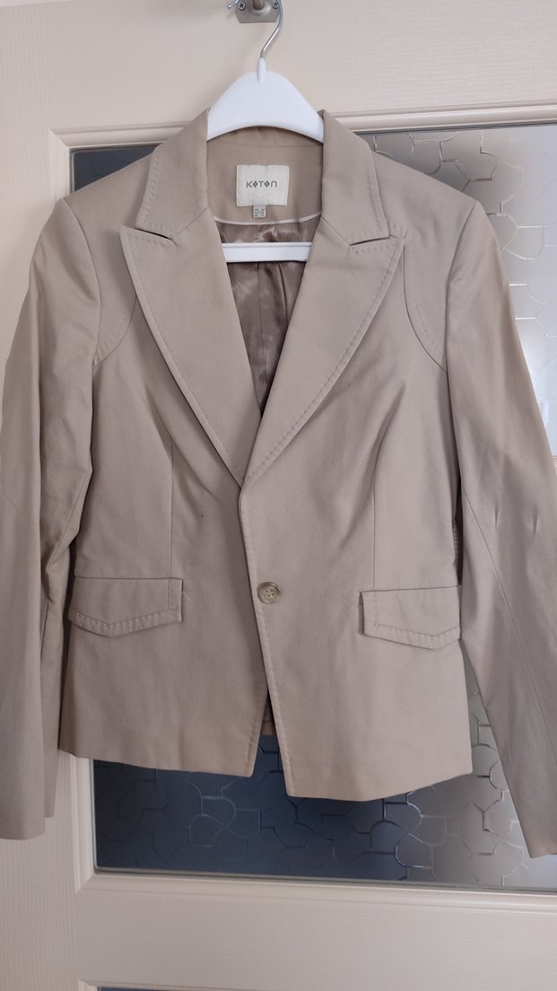 Düğmeli, bej renk kadın deri blazer ceket. Normal kesim, uzun kollu ve midi boydadır. Ofis ve günlük kullanıma uygundur.