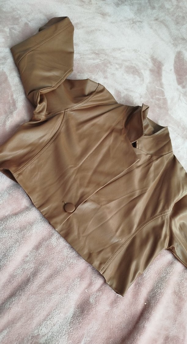 Düğmeli önü, yakalı ve uzun kollu, parlak bej renkte, vücuda oturan deri kadın ceket. Sokak stili için uygun. ✨askıda dururken az soyulmuş resimde belirttim ve fiyatı ona göre yazdım başka hiç bir sorunu yok doğru düz gün giymedim bile