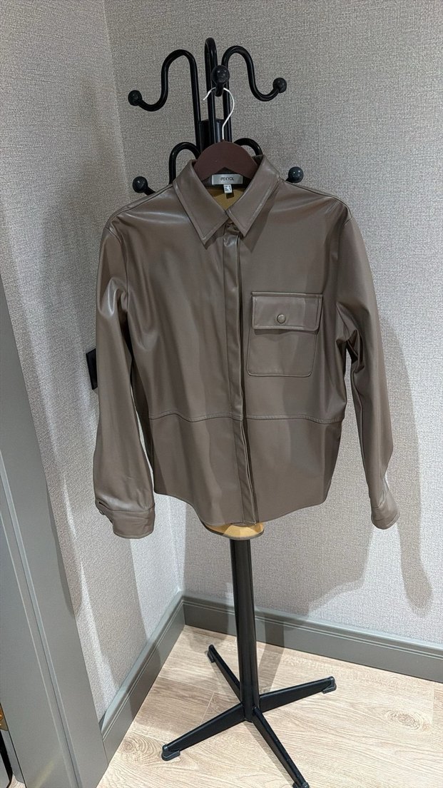 Düğmeli önü, tek cep ve uzun kollu bej kadın deri ceket, normal kesim ve yakalı tasarıma sahiptir. Casual ve ofis kullanımı için uygundur.