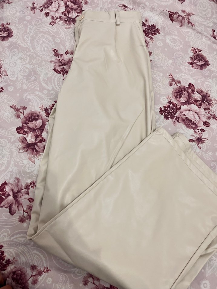 Düğmeli detaylı, düz bej kadın kumaş pantolon. Normal boy midi kesim, rahat sentetik kumaştan, günlük kullanıma uygundur.