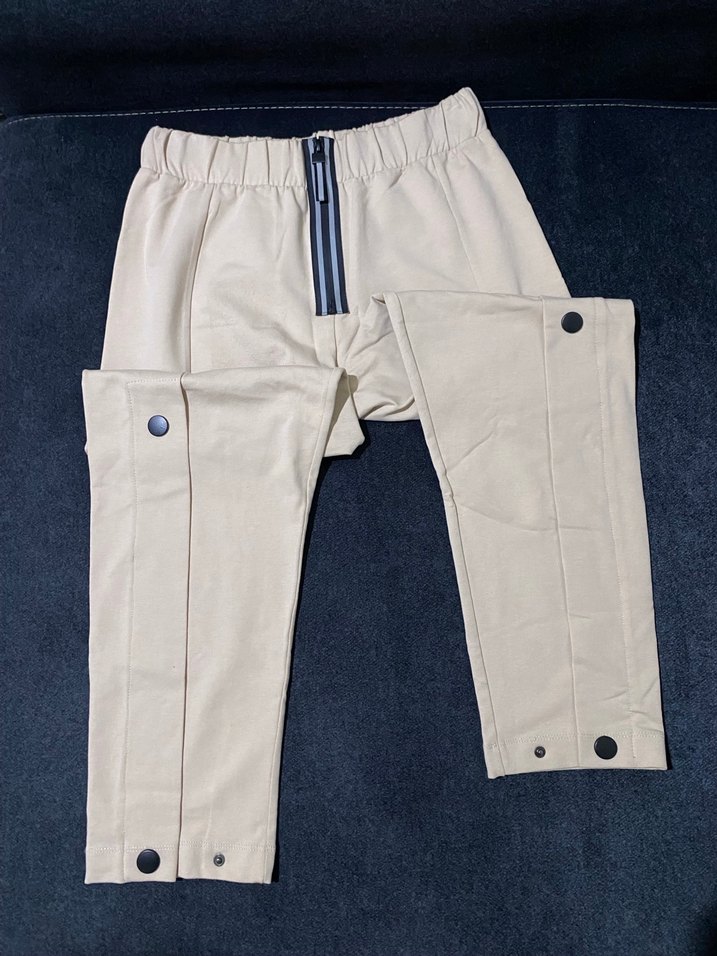 Bej renkli, düğmeli, normal boy kadın eşofman, rahat ve günlük kullanıma uygun. Hiç kullanılmamıştır