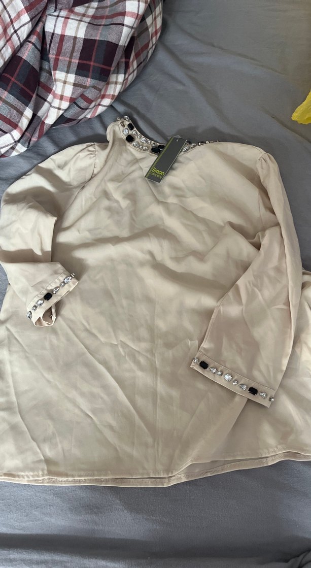 Bej renkli, uzun kollu, yakalı ve düğmeli manşet detayı bulunan kadın gömlek. Parlak sentetik kumaştan, rahat kesim, günlük sokak stiline uygun.