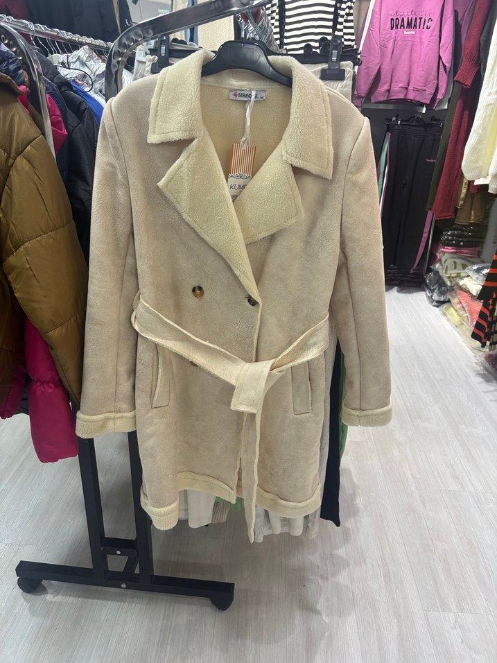 Bej renkte, düğmeli, midi boy kadın kaban. Yumuşak ve sıcak kumaştan, uzun kollu, regular fit. Bel kemeri ile şık ve rahat kullanım sağlar.