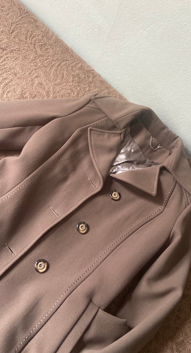 Düğmeli, çift sıra düğmeli, ön cepli, yumuşak ve sıcak kumaştan yapılmış bej kadın kaban.