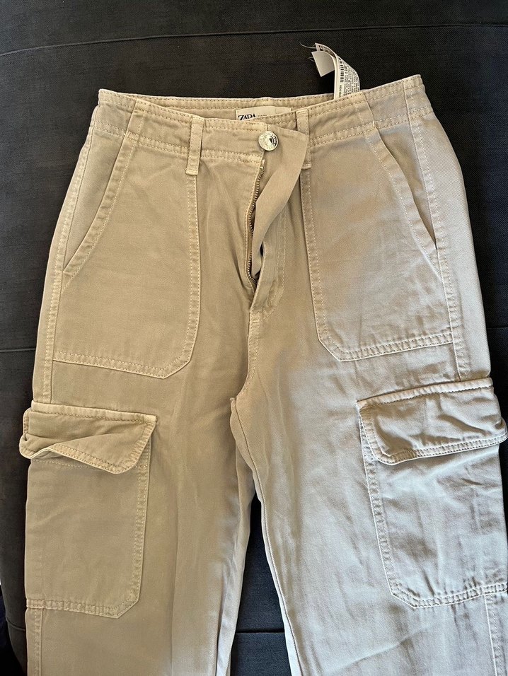 Düğmeli, bol kesim bej renkli pamuk kadın kargo pantolon, çok cepli ve günlük sokak stiline uygun. Yurtdışından Zaradan aldım 48-50-52kiloya olur
