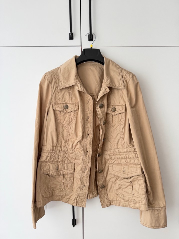 Bej keten kumaştan, düğmeli, normal boyda ve kesik yakalı kadın ceket. Uzun kollu ve rahat kesim, günlük sokak stili için uygun. ✨