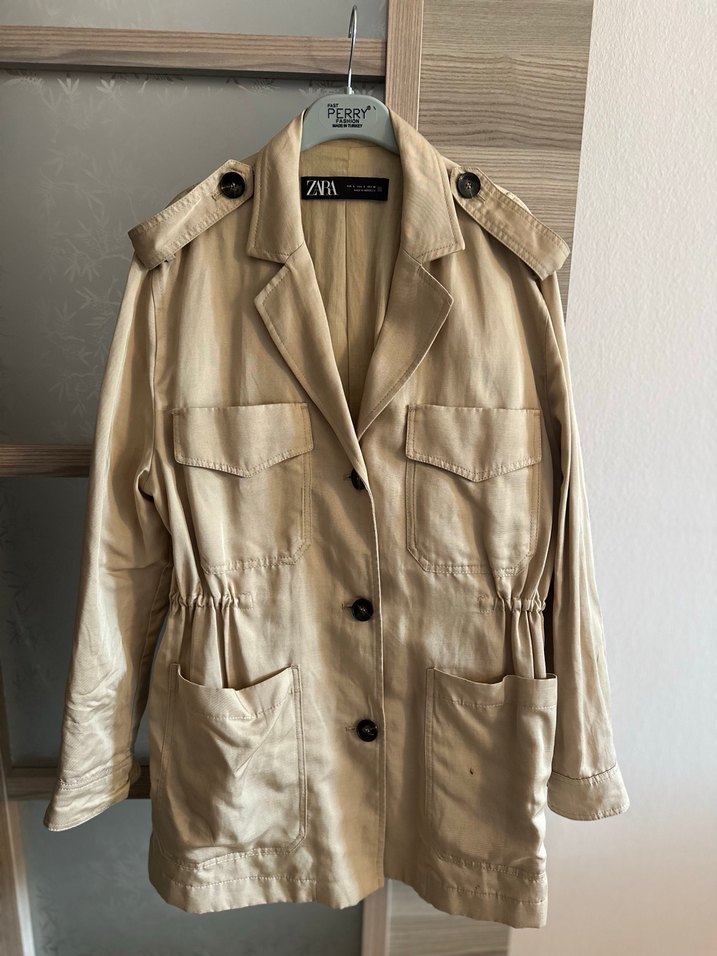 Düğmeli, keten kumaştan, bej renkli, notched yaka ve bol kesim kadın ceket. Askılı kollu ve cepli, günlük sokak stili için uygun.