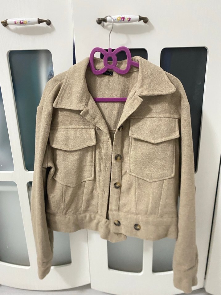 Düğmeli ön, uzun kollu bej keten ceket. Rahat kesimi ve sokak stiline uygun görünümüyle günlük kullanıma uygundur.