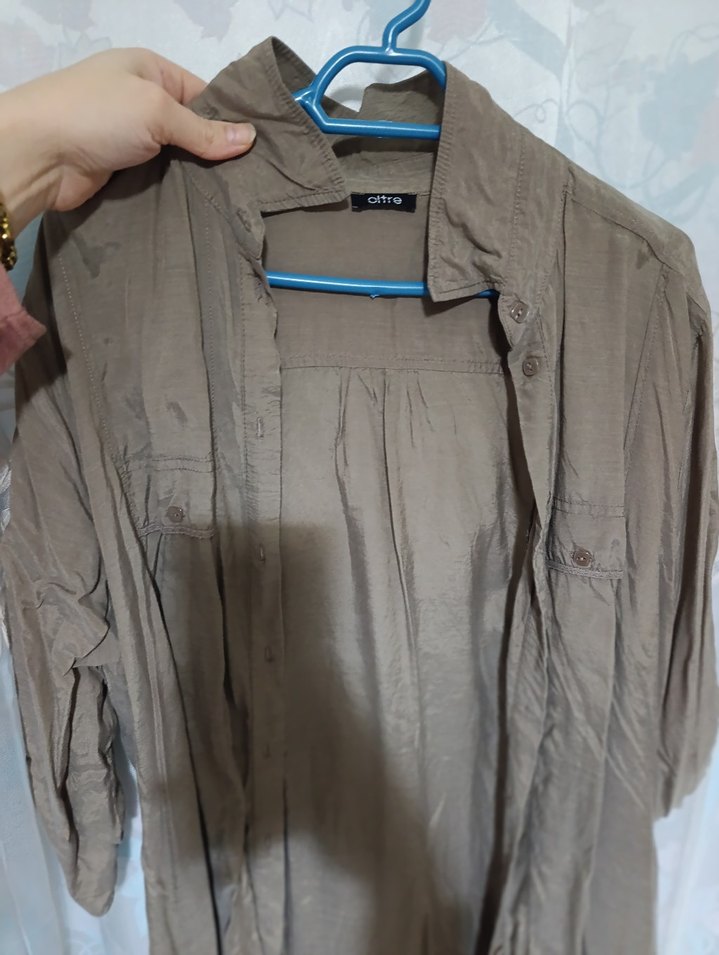 Bej keten gömlek, uzun kollu, düğmeli ve çıtçıtlıdır. Notlu yaka ve bol kesim midi uzunluğundadır, günlük rahat stil için uygundur.