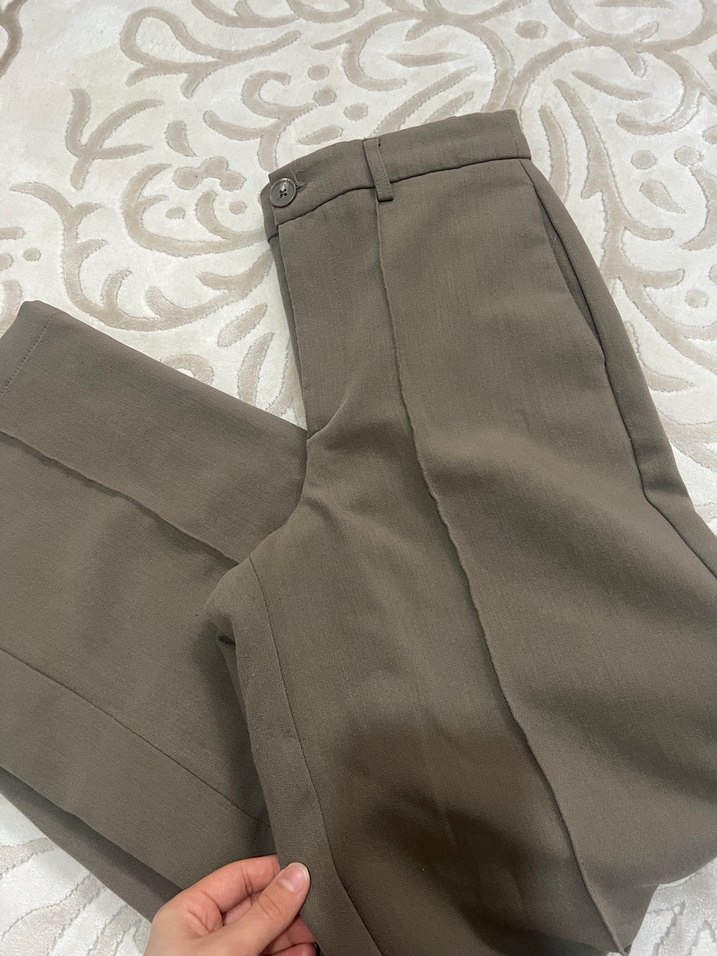 Düğmeli Bej Kadın Keten Kumaş Pantolon