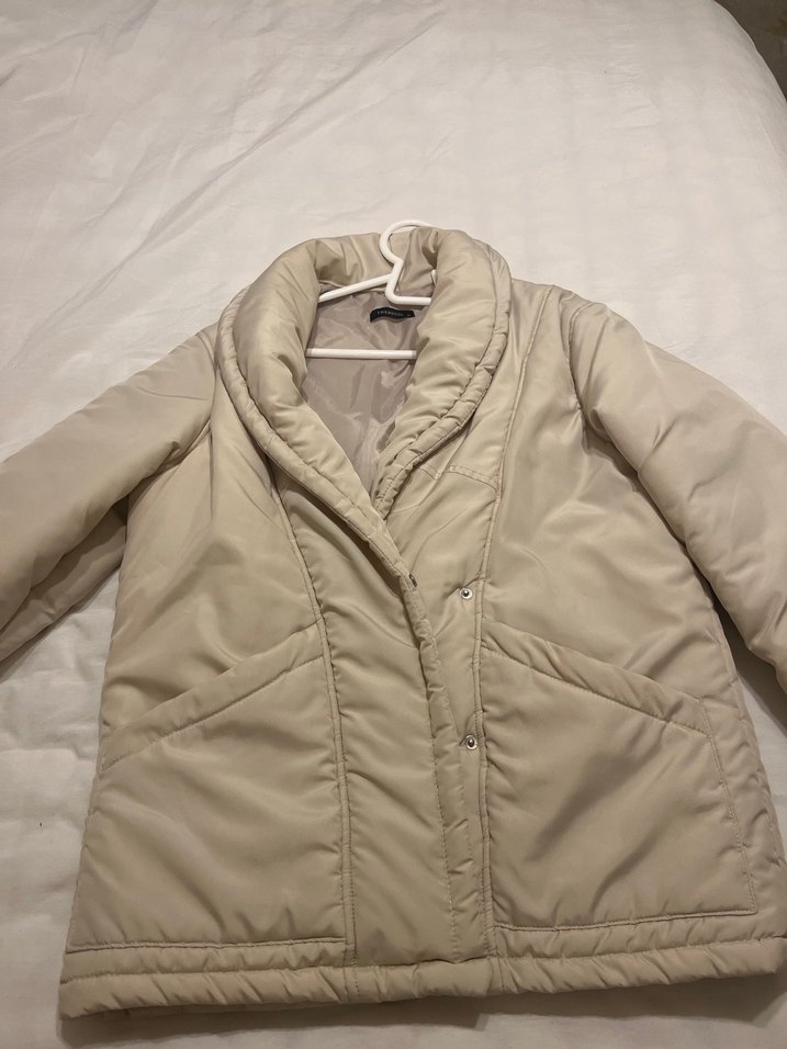 Düğmeli önü ve kesik yakası olan bej kadın kışlık ceket. Yumuşak keten kumaştan, bol kesim ve uzun kollu, günlük kullanıma uygun.