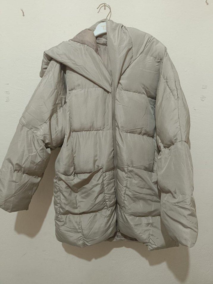 Düğmeli, bej renkli, bol kesim kadın kışlık mont. Yumuşak keten kumaştan, uzun kollu ve normal uzunlukta, günlük kullanıma uygun.uzunluk77cm