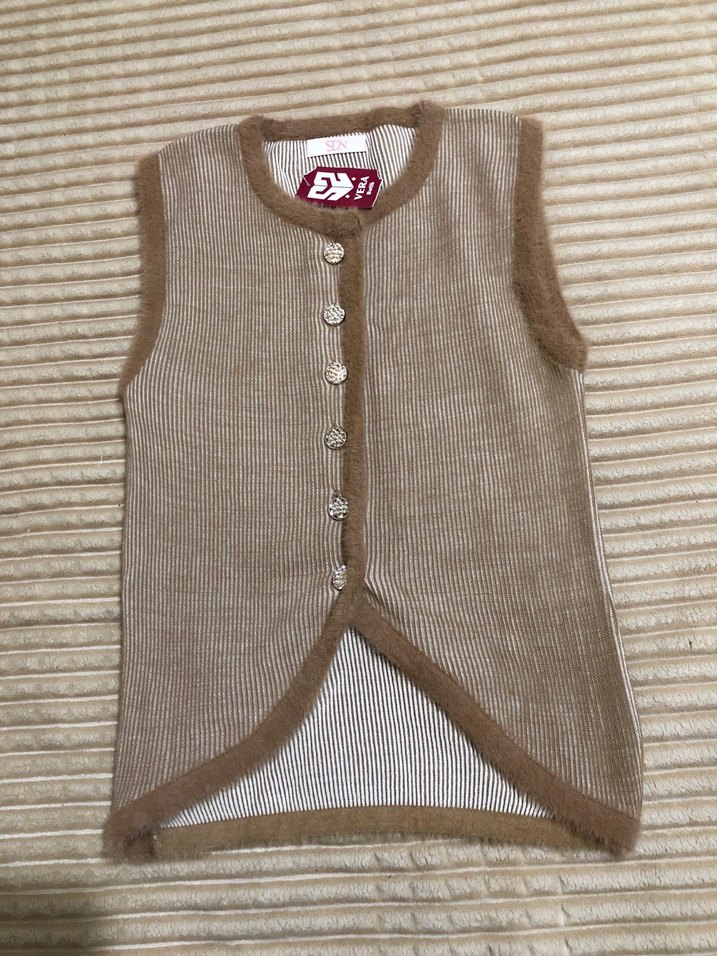 Bej renkte, düğmeli, kolsuz ve bisiklet yaka, yumuşak triko kumaştan yapılmış, vücuda oturan kadın yelek.