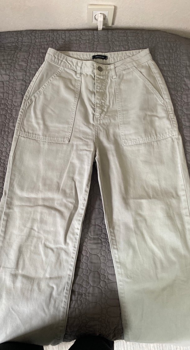 Düğmeli, bej renkli, pamuklu, bol kesim ve normal boy kadın kot pantolon. Günlük rahat kullanıma uygundur. Rengi soluk yeşil gibi bir şey