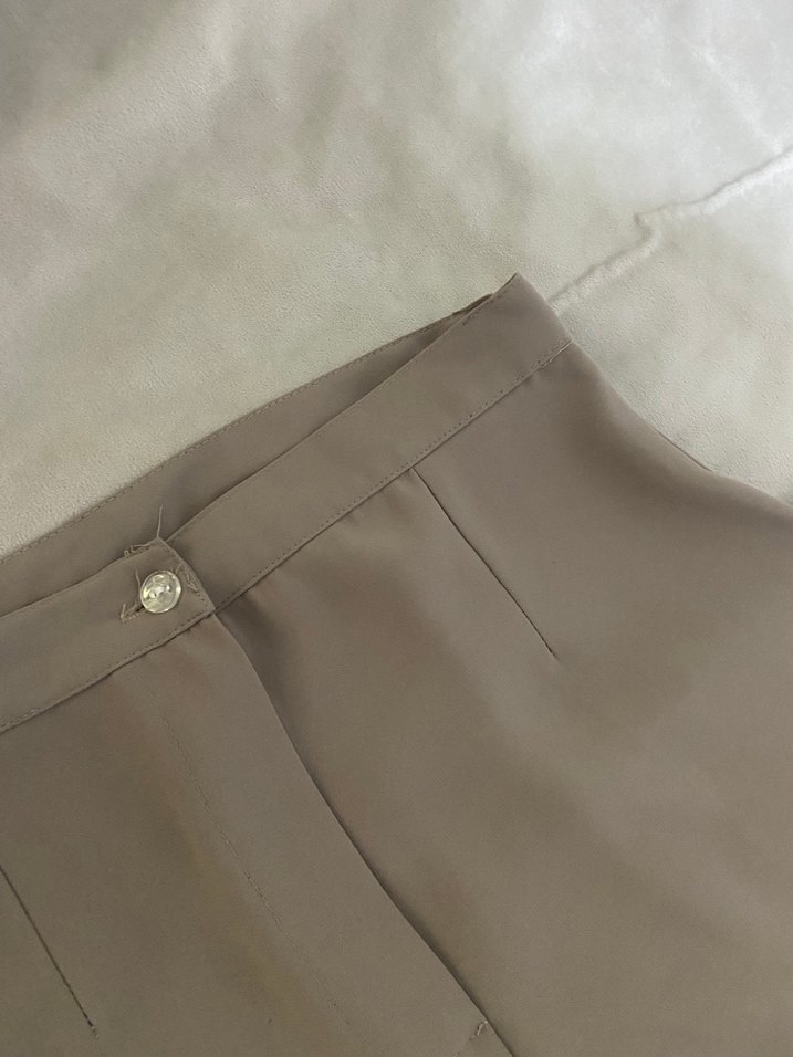 Düğmeli, regular fit bej kadın kumaş pantolon. Yumuşak sentetik kumaştan yapılmış midi boy, minimalist tarzda günlük kullanım için uygundur.